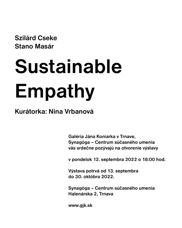 Kurátorský projekt Niny Vrbanovej prepája umelecký program dvojice vizuálnych umelcov z Maďarska a Slovenska. V špecifickom priestore bývalej židovskej synagógy si kladie naliehavú otázku, či a nakoľko existuje udržateľnosť bez empatie. Prostredníctvom výstavnej situácie, v ktorej navzájom komunikujú a kooperujú dve výrazné umelecké pozície z odlišných krajín a kontextov, vyzýva k empatii ako podmienke akejkoľvek udržateľnosti, trvácnosti a rozvoja.