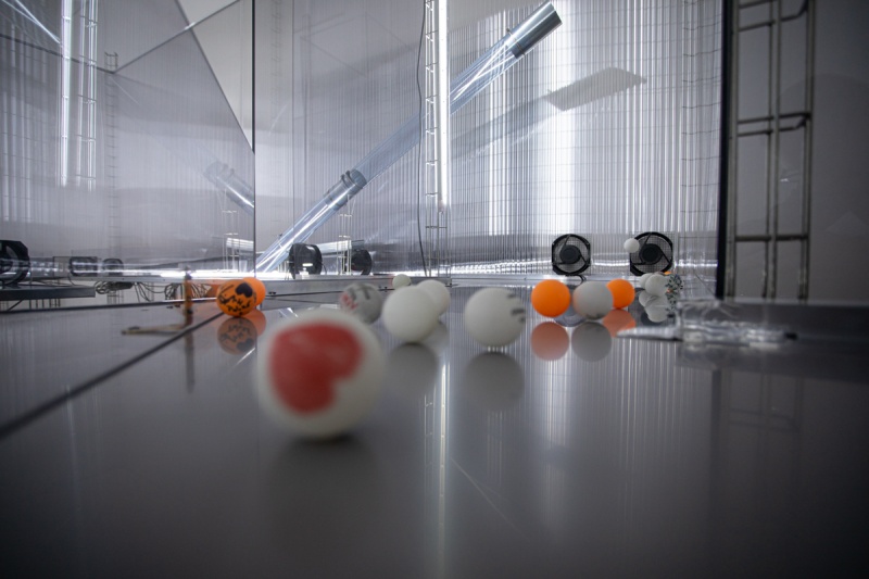 Dominantná interaktívna inštalácia Szilárda Csekeho je vizuálnou alúziou nepretržitého civilizačného toku, evolučnej „mašinérie“ života vrátane jeho hrdinov a trendsetterov, ale aj odpadlíkov. Dynamický a miestami až rachotivo industriálny pohyb ako metaforu existencie možno spomaliť a zjemniť zanechaním vlastného odkazu na jednej z pingpongových loptičiek. Univerzálna situácia sa tak stáva mimoriadne humánnou.