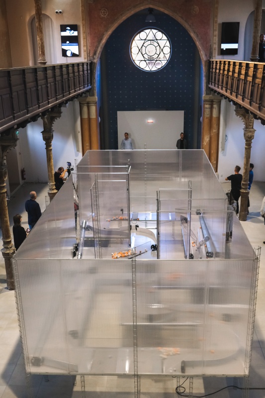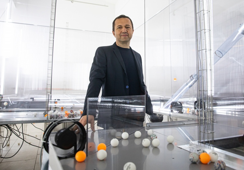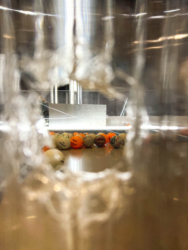 Szilárd Cseke’s dominant interactive installation is a visual allusion to the unremitting flow of civilisation, the evolutionary “machinery” of life including its heroes and trendsetters, and also its dissenters. Dynamic, in places clamorous, industrial movement, as a metaphor of existence, may be decelerated and refined by leaving one’s own message on one of the pingpong balls. The universal situation thus becomes exceptionally human.